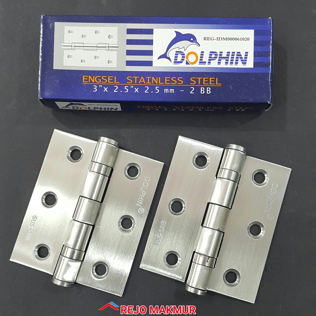Engsel Jendela stainless merk DolphinSpesifikasiUkuran : 3"x2.5"x2.5mm (tinggi 7,5cm dan lebar satu sisi 2,5cm)Bahan : StainlessSatuan : 1 Pasang (