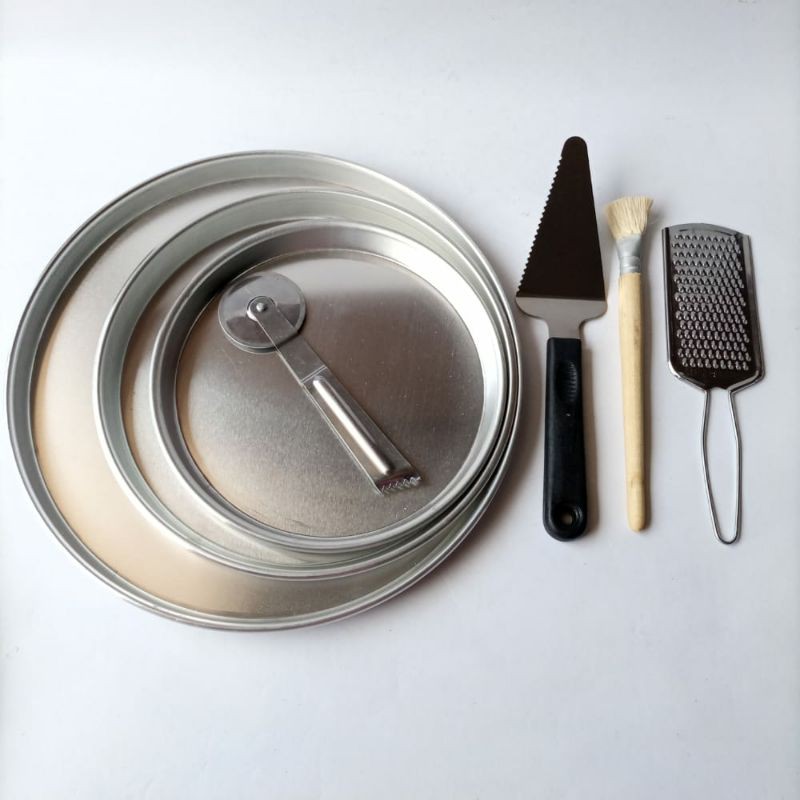 paket terdiri dari : *Loyang pizza diameter atas ukuran- 30cm- 22cm- 20cm*Roller pizza / pemotong pizza*Spatula pizza*kuas ukuran besar*parutan kejuharga sudah tertera 1set..#loyang#loyang#kue#loyang##bolu#loyang#cetakan#kue##belajar#masak##solusi#jago#m