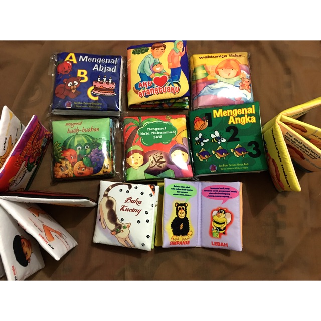 Soft book/ buku bantalIdr : 20.000-27.000Bahan yang digunakan 100% baru. Kain polyester dan diisi serat silikon. Bisa dicuci dengan tangan menggunakan air dingin dan sabun lembut Cocok untuk bayi sampai TK, karena buku berisi bahan edukasi untuk buah hati. Mulai mengenal angka, huruf, warna, hewan, anggota tubuh & masih banyak lagi cerita-cerita dalam buk