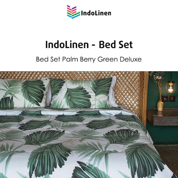 Deskripsi Indolinen Bed Set Palm Berry Green Deluxe Indolinen Bed Set CVC Palm Berry Green Deluxe1 set berisi :1 pcs fitted sheet2 pcs pillow cases 50x75cm2 pcs bolster cases dia 23x100cm1 pcs bed cover Material : CVC TC 200Colour : GreenKeunggulan :- Bahannya sangat lembut dan halus- Terdapat karet di setiap ujungnya untuk memudahkan pemasangan- Terdapat tali di duvet cover untuk memudahkan pemasangannote: Thread Count (TC) adalah kerapatan suatu benang, di mana semakin tinggi TC tersebut maka akan semakin halus pula materialnya.Panduan ukuran:Extra Single (kasur 90x200x30)Single (kasur 100x200x30)Twin (kasur 120x200x30)Queen (kasur 160x200x30)King (kasur 180x200x30)Extra King (kasur 200x200x