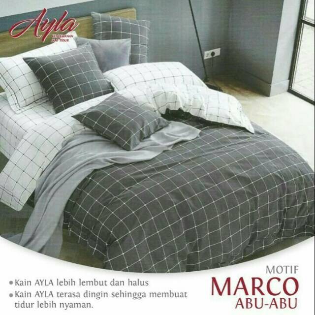 Bedcover & Sprei Set Premium Katun AYLA Motif Marco Abu Terbaru- Proses Pengerjaan 2 hari- Jahitan Rapih- Bahan Katun AYLA yang lembut, tidak kasar dan tidak berbulu.- Menggunakan Karet Rel yg kuat dan tahan lama di keempat sudut sprei (fitted)Isi Paket :Uk. 90x200 (Bedcover, Sprei, 1 sarban, 1 sargul)Uk. 100x200 (Bedcover, sprei, 1 sarban, 1 sargul) No. 4Uk. 120x200 (Bedcover, sprei, 1 sarban, 1 sargul) No. 3Uk. 140x200 (Bedcover, Sprei, 2 sarban, 2 sargul)Uk. 160x200 (Bedcover, sprei, 2 sarban, 2 sargul) No. 2Uk. 180x200 (Bedcover, sprei, 2 sarban, 2 sargul) No. 1Uk. 200x200 (Bedcover, sprei, 2 sarban, 2 sargul) Extra King+ Penambahan tinggi sprei dikenakan biaya 10.000 per 5 cm+ Penambahan Sarung Bantal / Guling dikenakan biaya 40.000 per 2 pcs+ Penambahan Elastic Lock ( Anti Geser ) dikenakan biaya 10.000#sprei #spreianak #spreiantigeser #spreiset#spreisetbedcover#spreisetmurah#spreiselimut#spreishabby#spreishabbychic#spreikatunjepang#seprai#sepraimurah#sepraimini