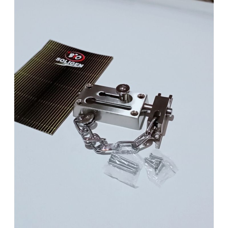 Grendel Rantai - Merk : Bio soligen- Material : Zinc Alloy- Warna : Satin Nickel (SN)Dimensi :- Grendel : 7,7 cm x 4,1 cm - Plat Lawan : 7,9 cm x 1,8 cm - Panjang Rantai : 17 cmHarga pe